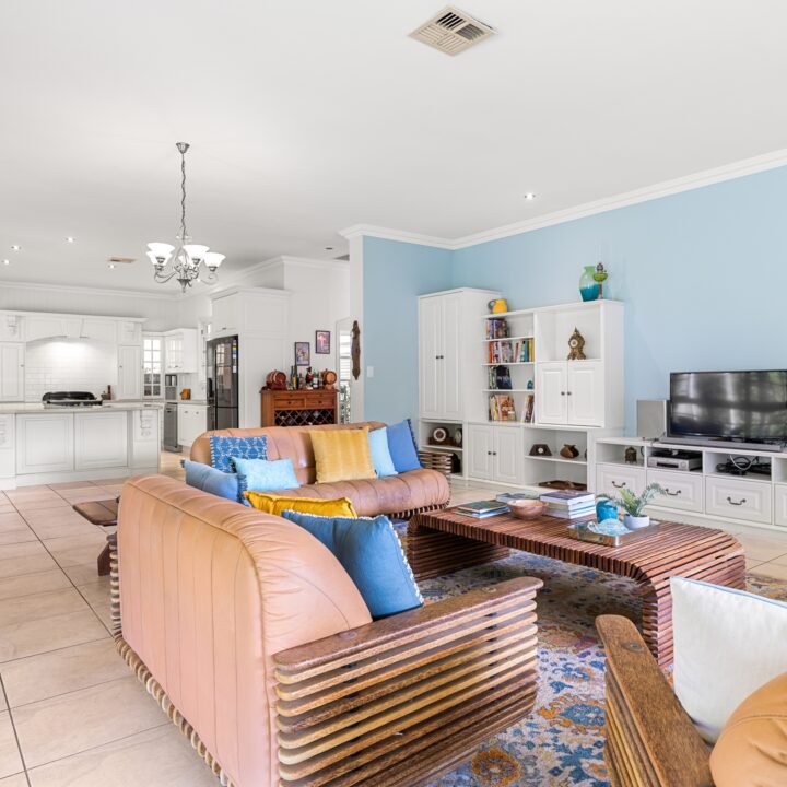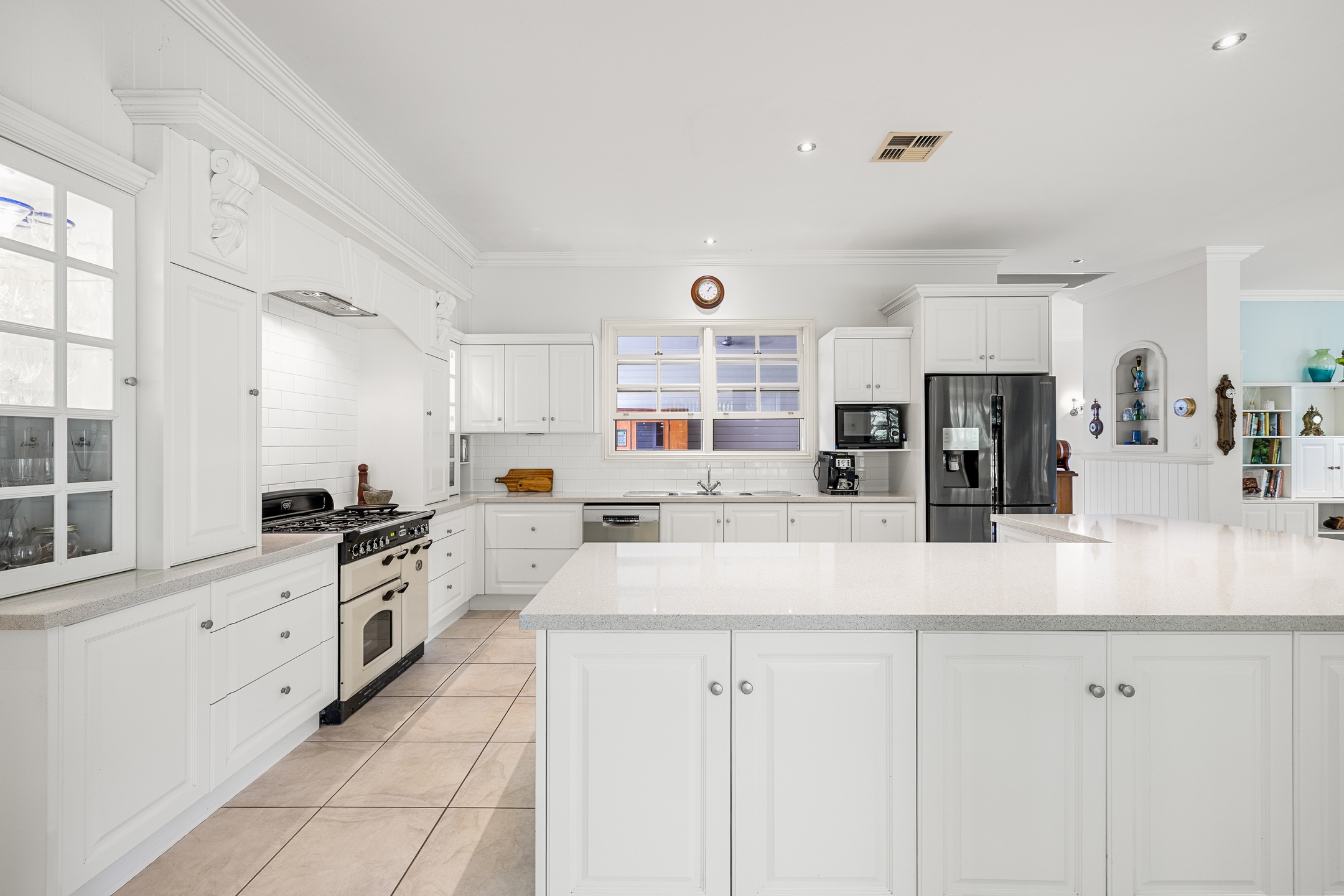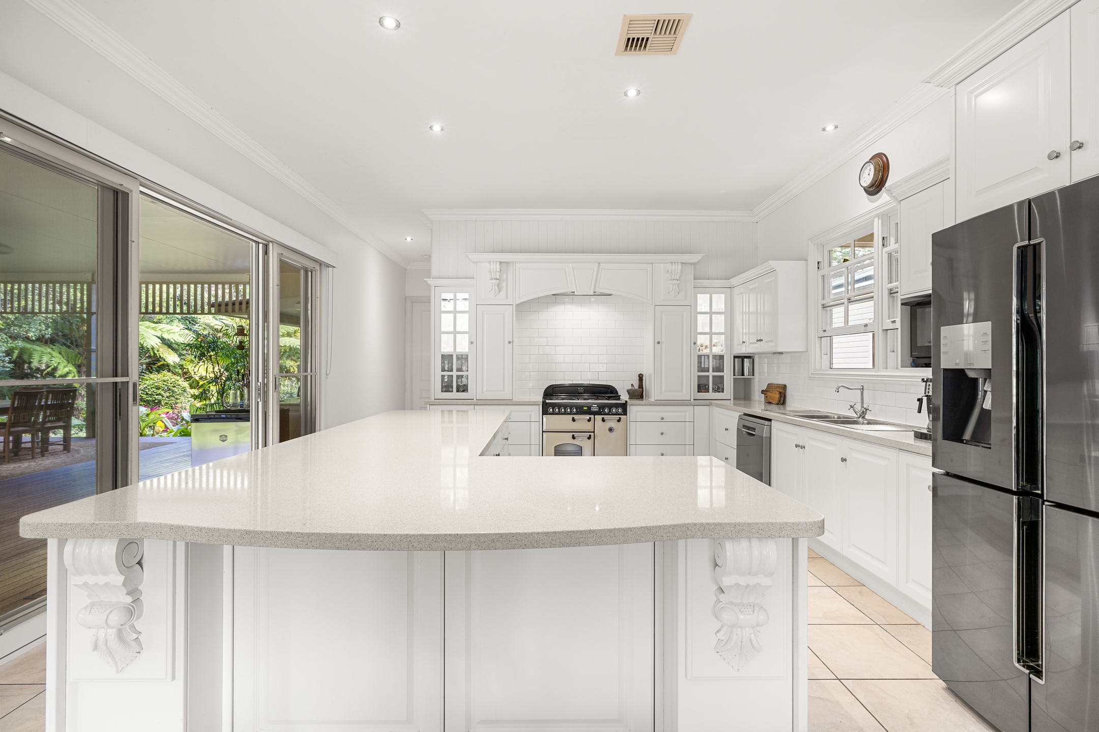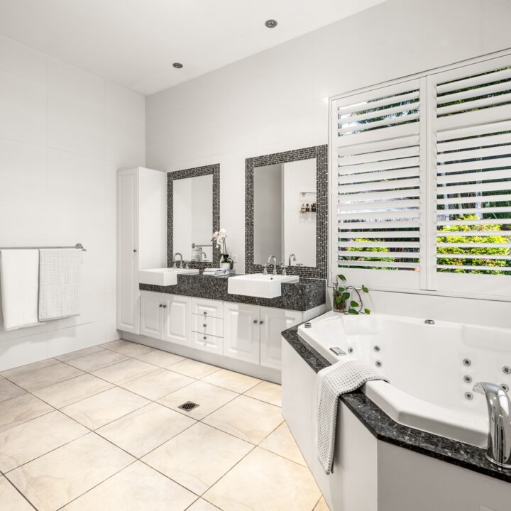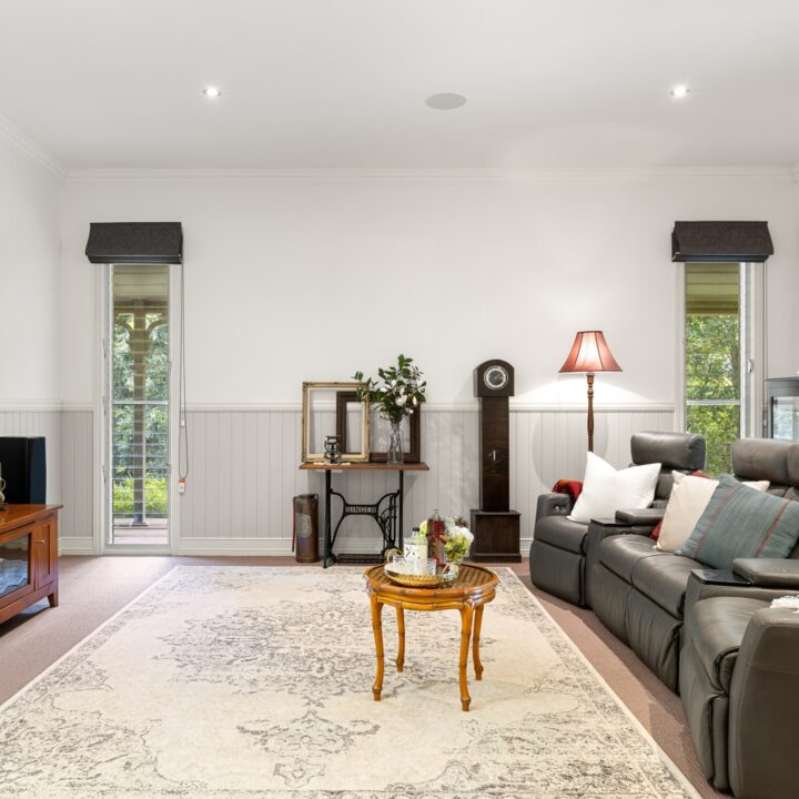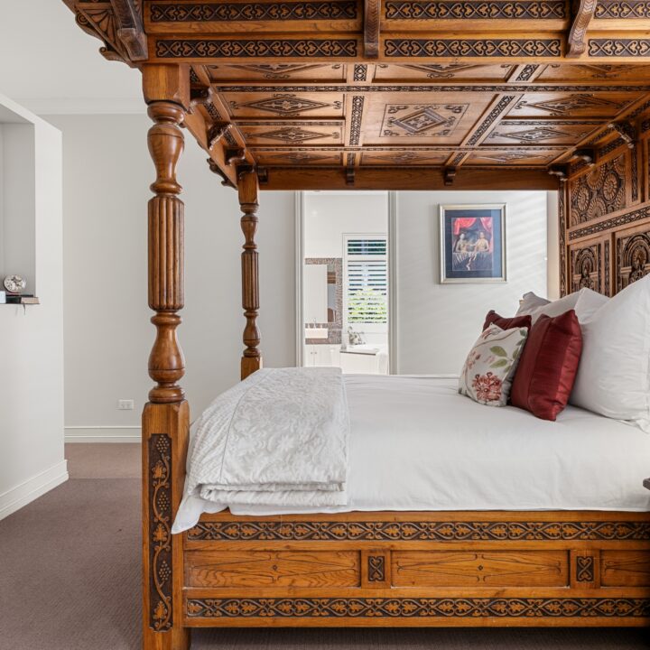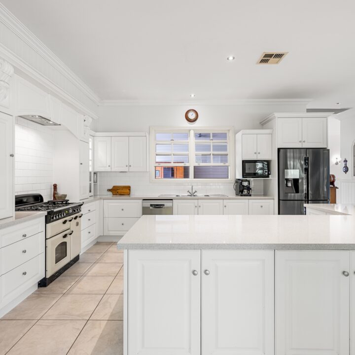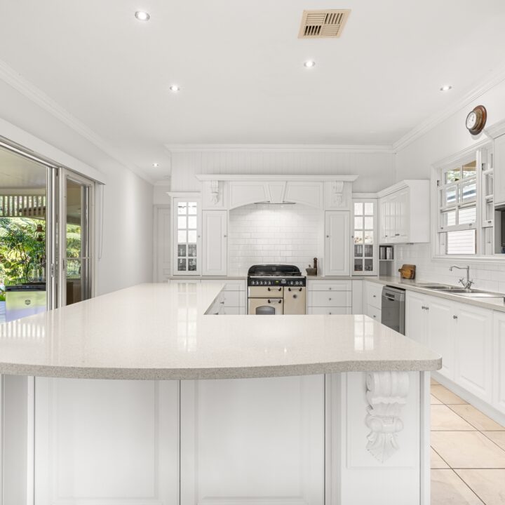 – East wing: Family living, entertainer’s kitchen with 40mm stone benchtops & 900 mm Falcon gas range, huge deck with outdoor kitchen, main suite with WIR, ensuite, sitting room and office/nursery