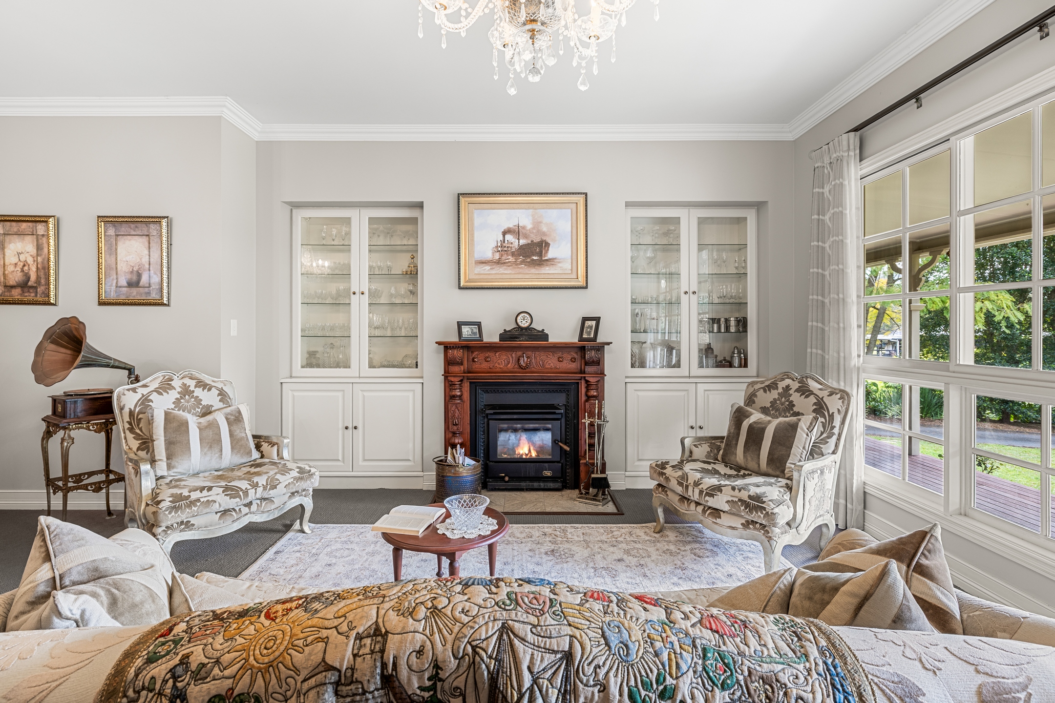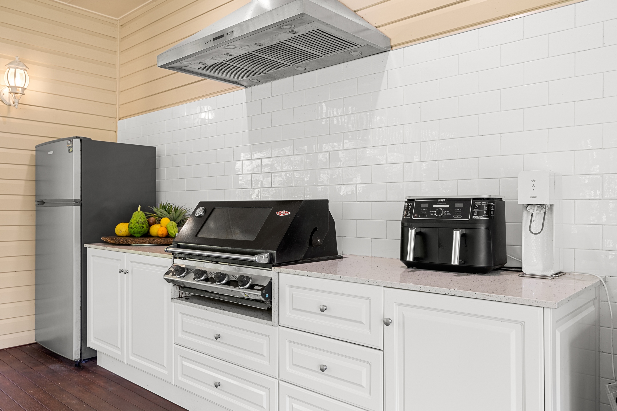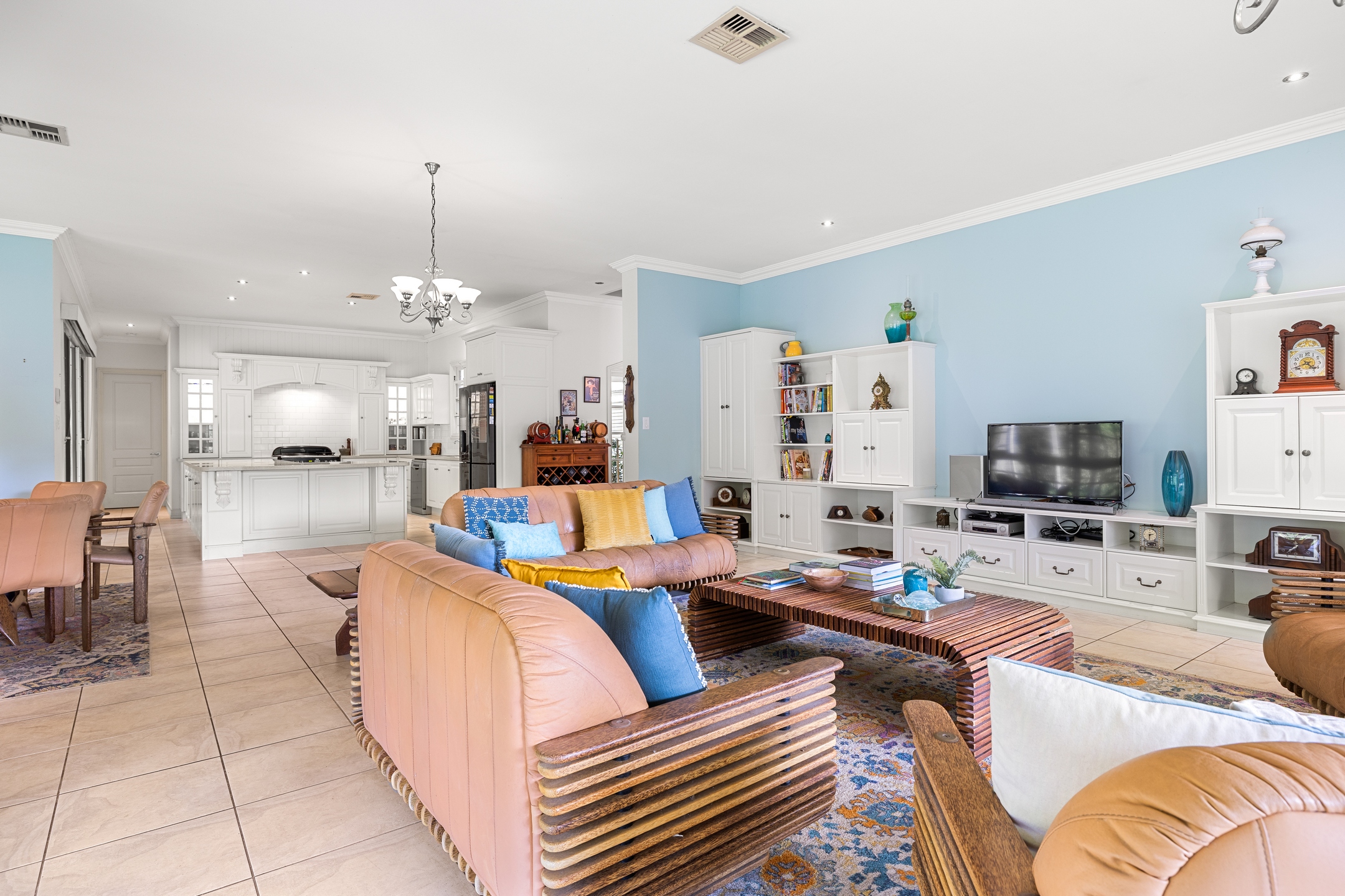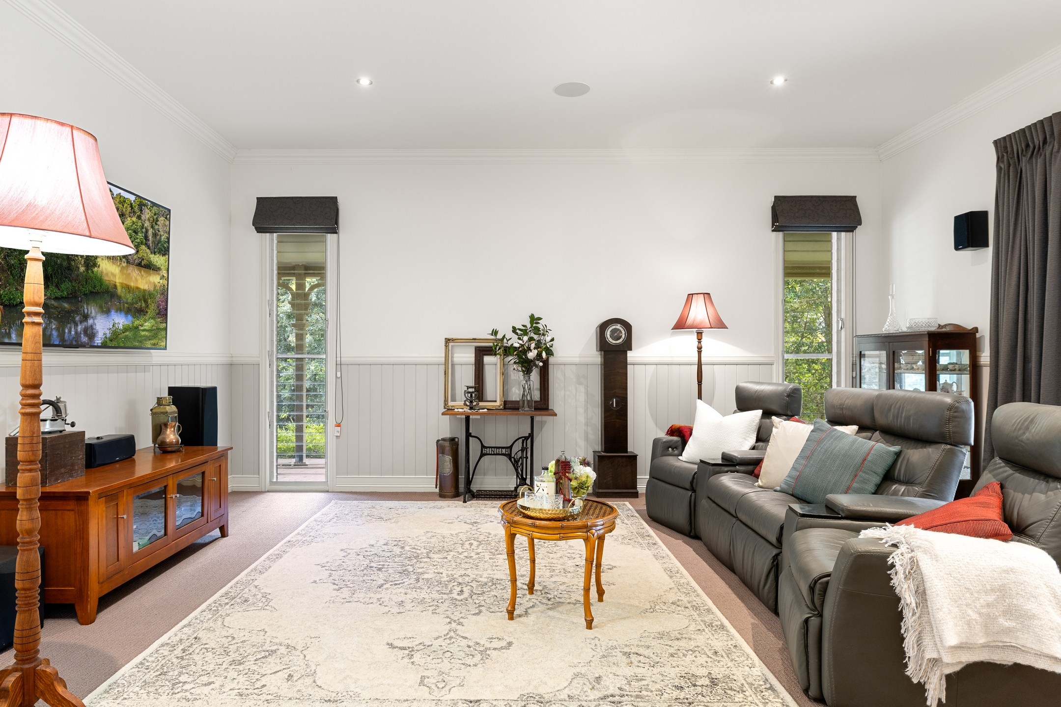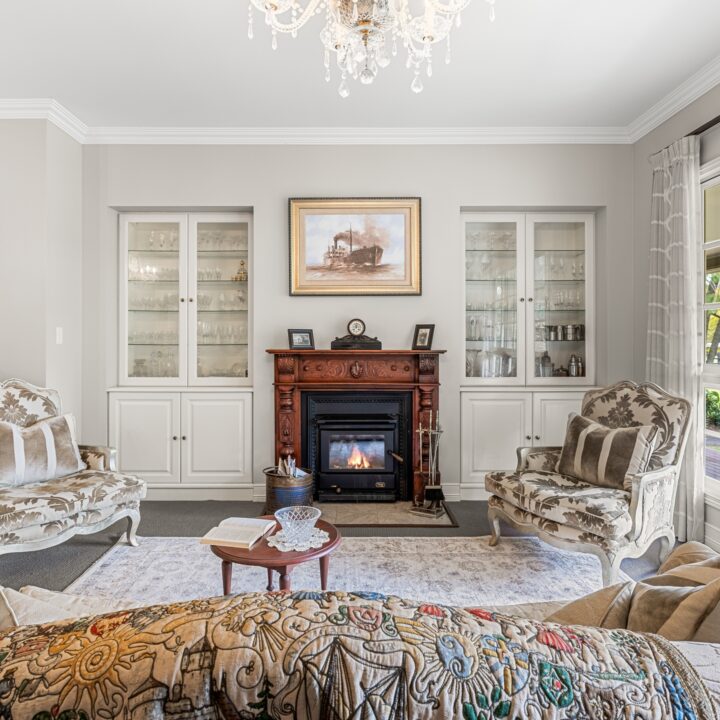 – East wing: Family living, entertainer’s kitchen with 40mm stone benchtops & 900 mm Falcon gas range, huge deck with outdoor kitchen, main suite with WIR, ensuite, sitting room and office/nursery