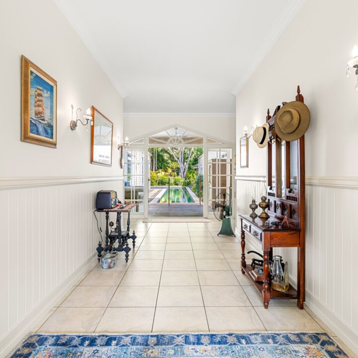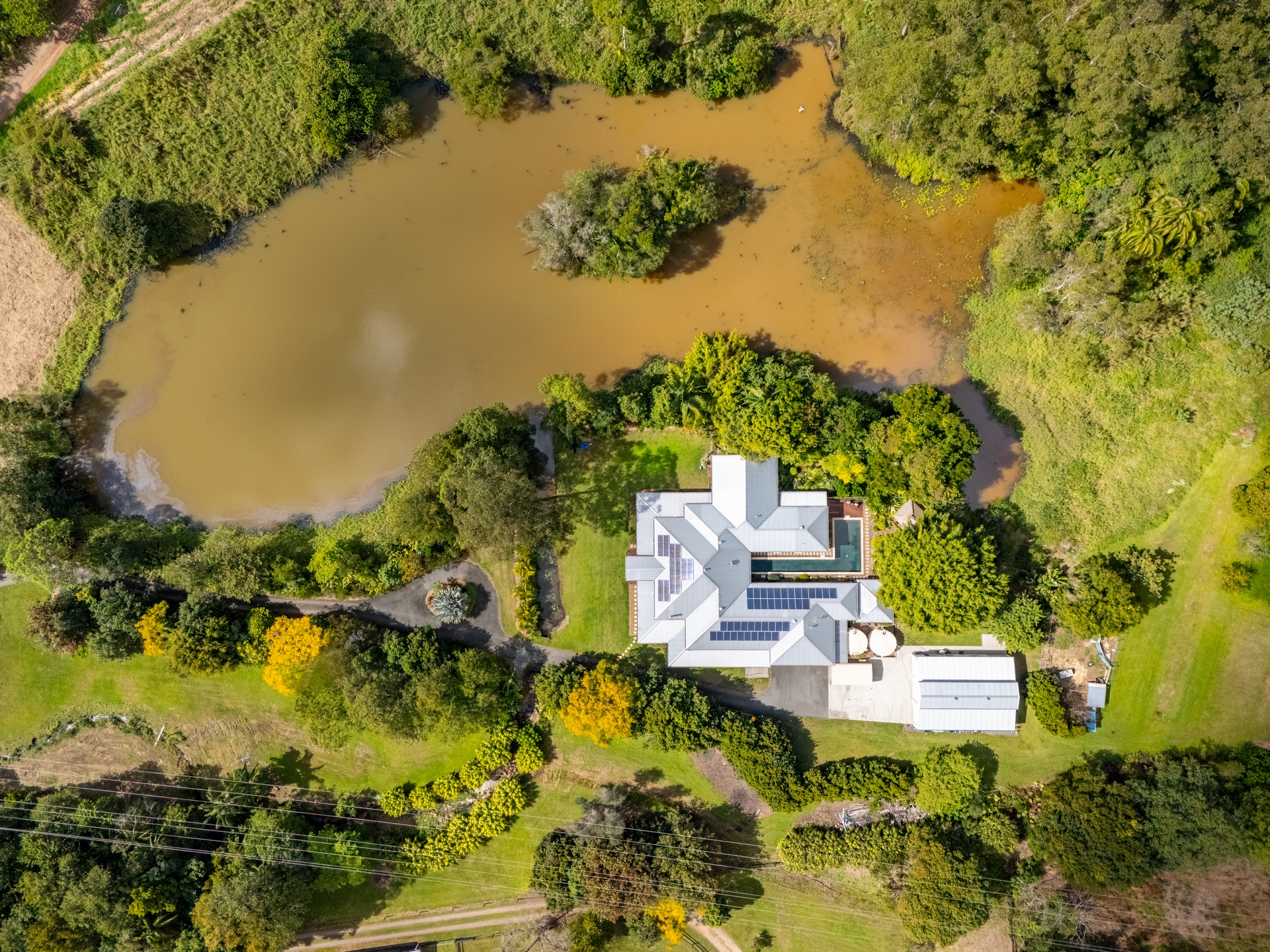 From the wide foyer entry, the home opens to light-filled interiors framed around the sparkling 18-metre L-shaped saltwater pool. Two thoughtfully designed wings offer flexible family living, while multiple alfresco spaces invite relaxed entertaining with views over tropical gardens, water features, and the vast spring-fed dam for which the property is named.